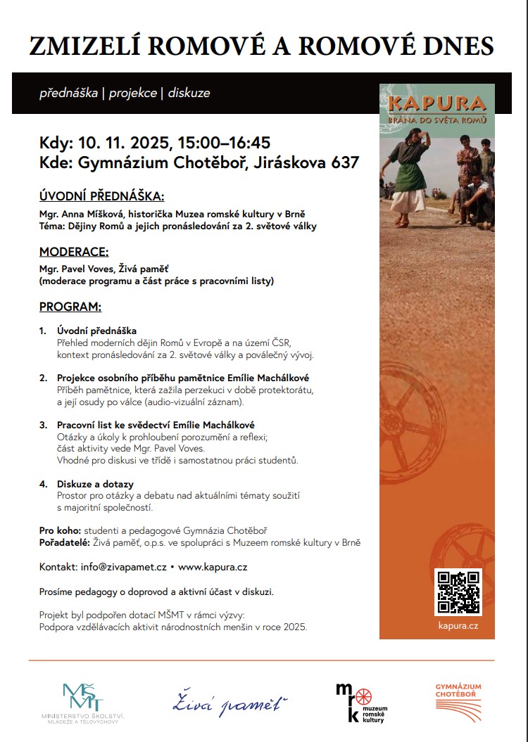 10. 11. 2025 v době od 15:00–16:45 se na Gymnáziu Chotěboř konala přednáška Mgr. Anny Míškové, historičky Muzea romské kultury v Brně na téma: Dějiny Romů a jejich pronásledování za 2. světové války. Celý článek