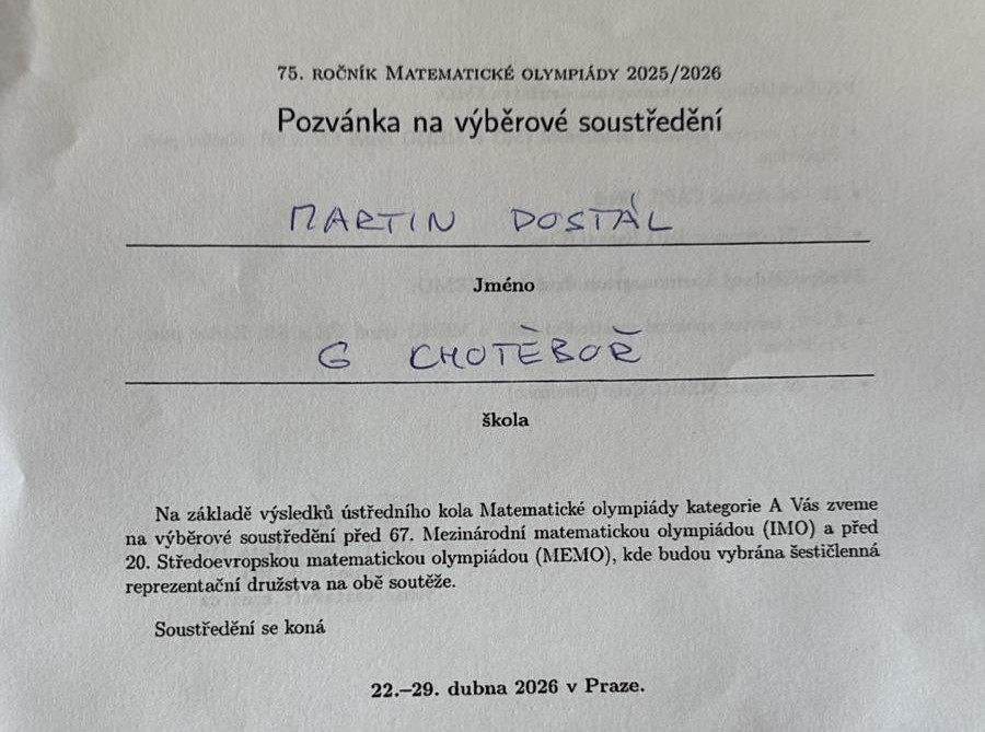 Po vítězství v krajském kole matematické olympiády mezi maturanty uspěl Martin Dostál i mezi svými vrstevníky. Celý článek
