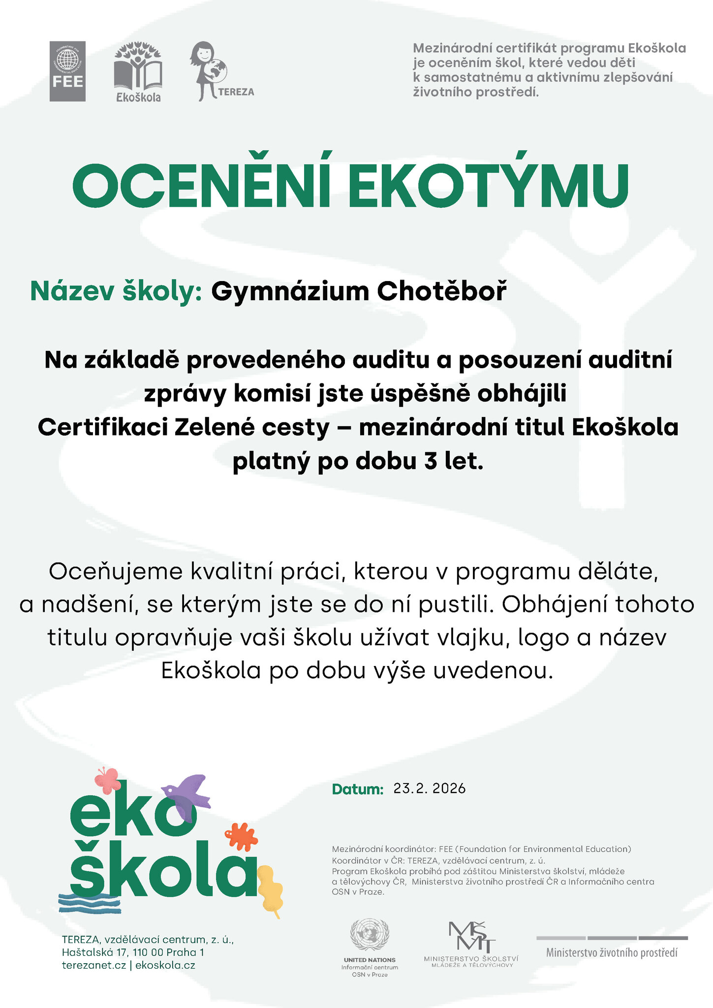 V tomto školním roce se Gymnázium Chotěboř bude pokoušet již počtvrté obhájit prestižní mezinárodní titul Ekoškola, který jsme obdrželi v letech 2013, 2015 a 2017. Celý článek