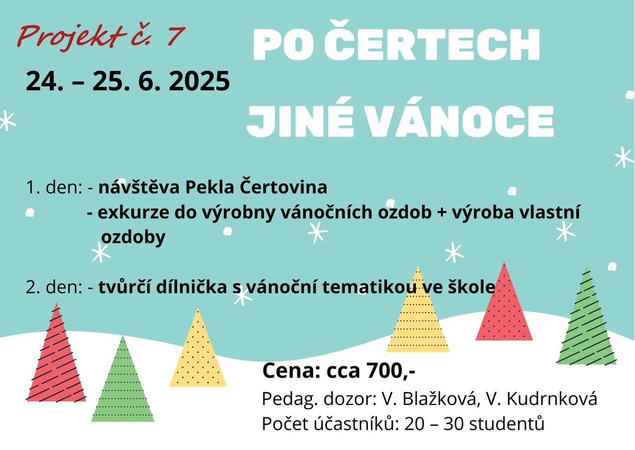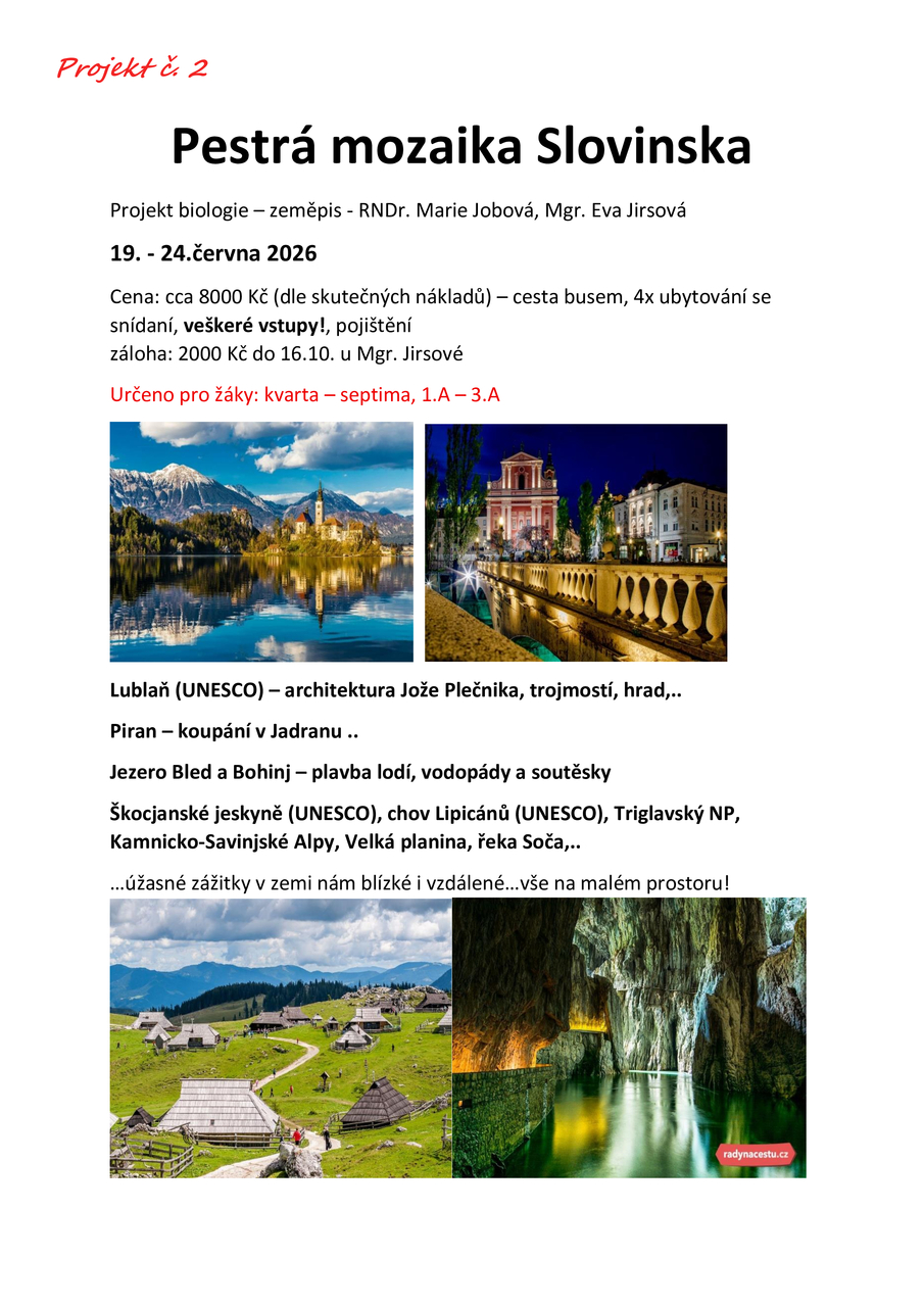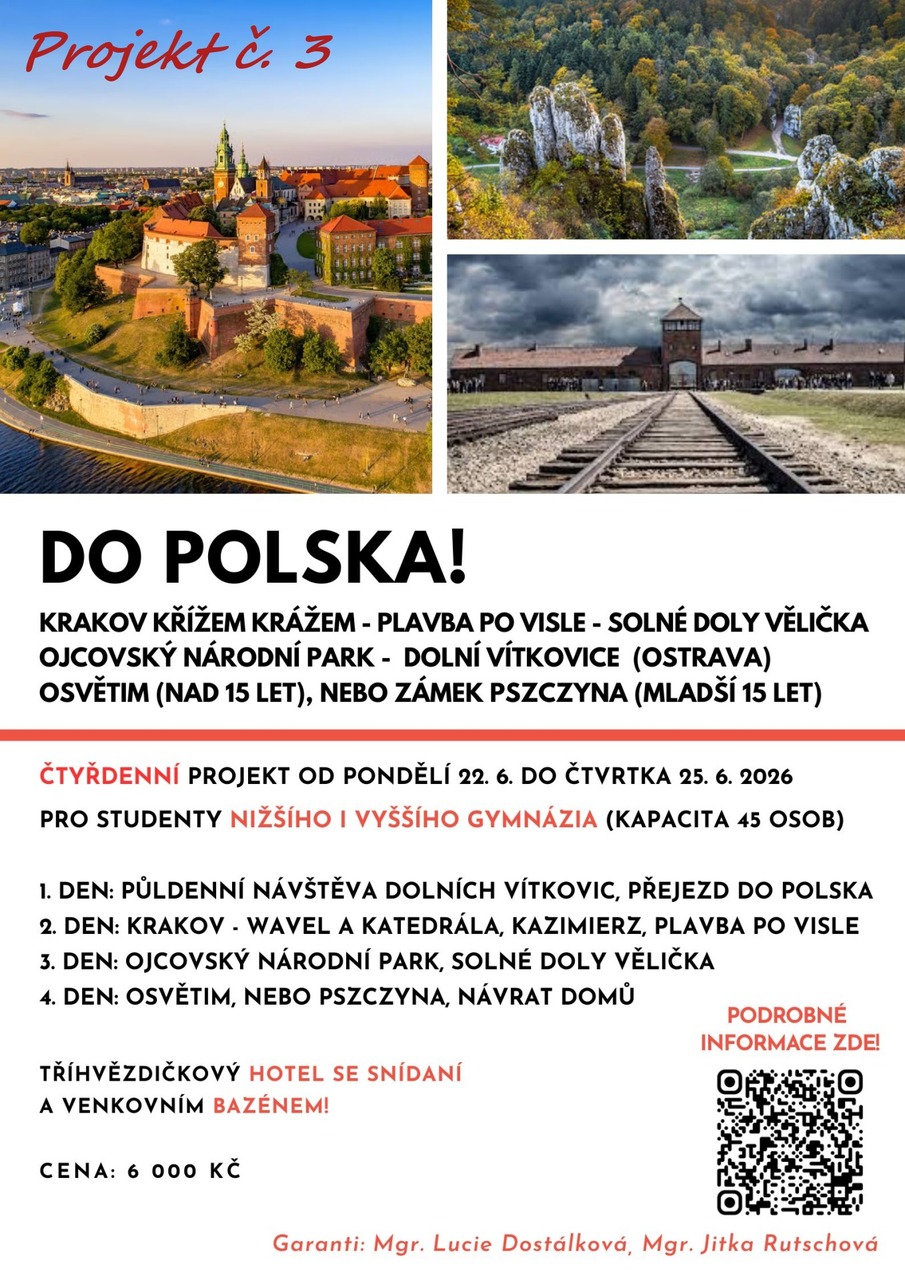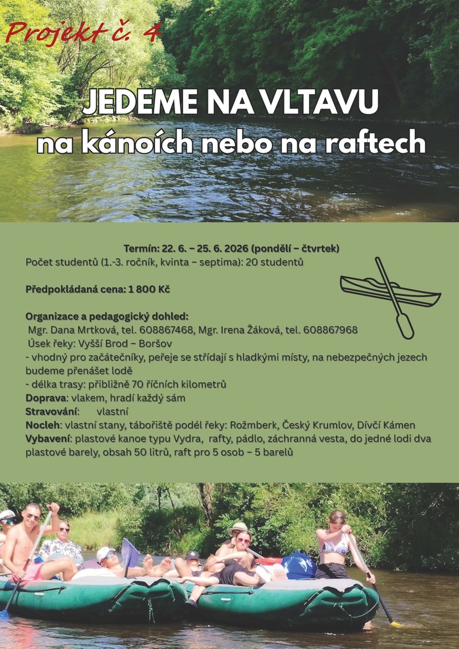 Pročtěte si letáčky a pokud máte další dotazy, neváhejte se zeptat jednotlivých učitelů (garantů projektu), kteří vám rádi odpoví. U všech nabídek najdete termíny (u většiny je to 24. - 25. 6. 2025, u zahraničích pak více dnů), předpokládanou cenu a popř. minimální věk/ třídu.