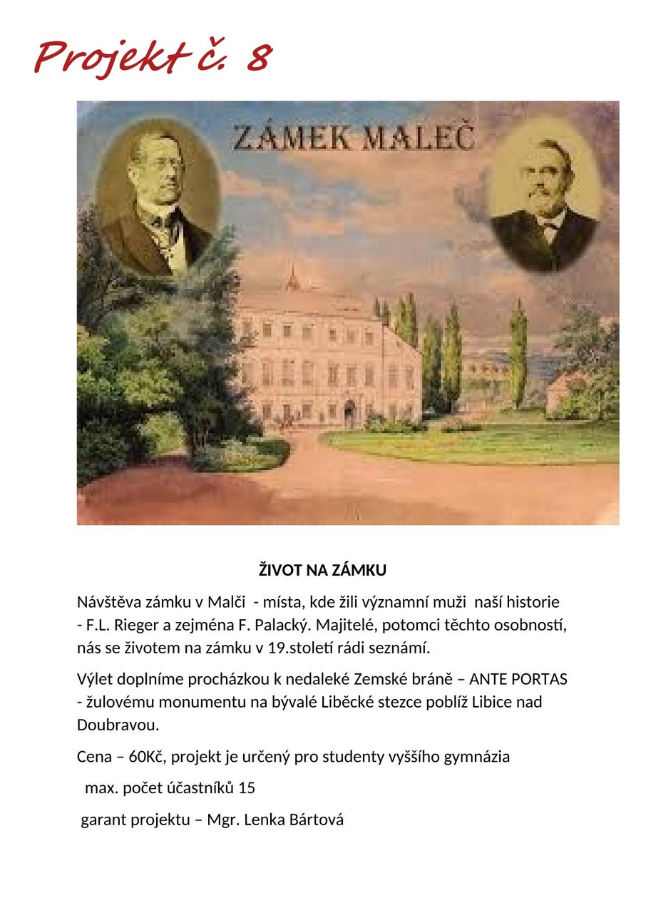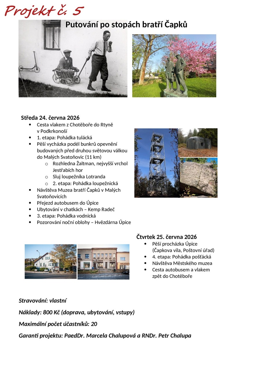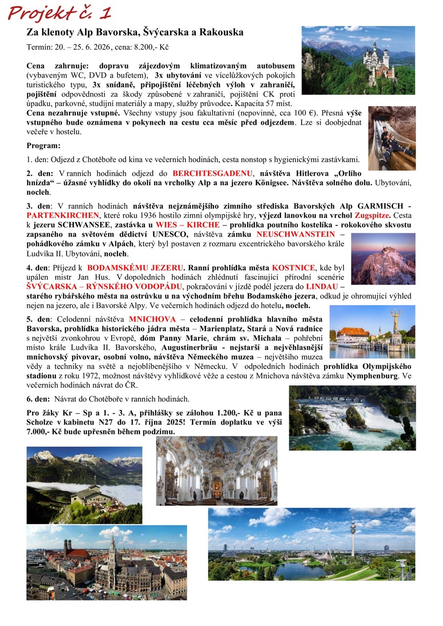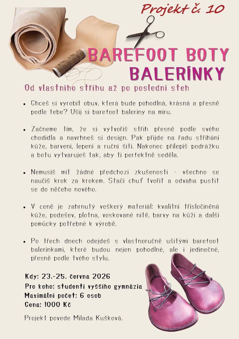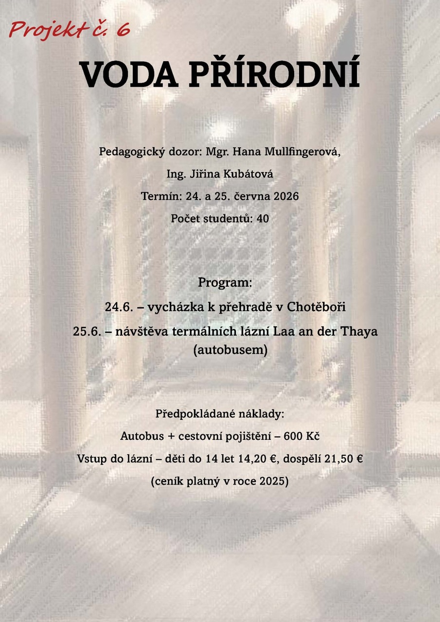 Pročtěte si letáčky a pokud máte další dotazy, neváhejte se zeptat jednotlivých učitelů (garantů projektu), kteří vám rádi odpoví. U všech nabídek najdete termíny (u většiny je to 24. - 25. 6. 2025, u zahraničích pak více dnů), předpokládanou cenu a popř. minimální věk/ třídu.