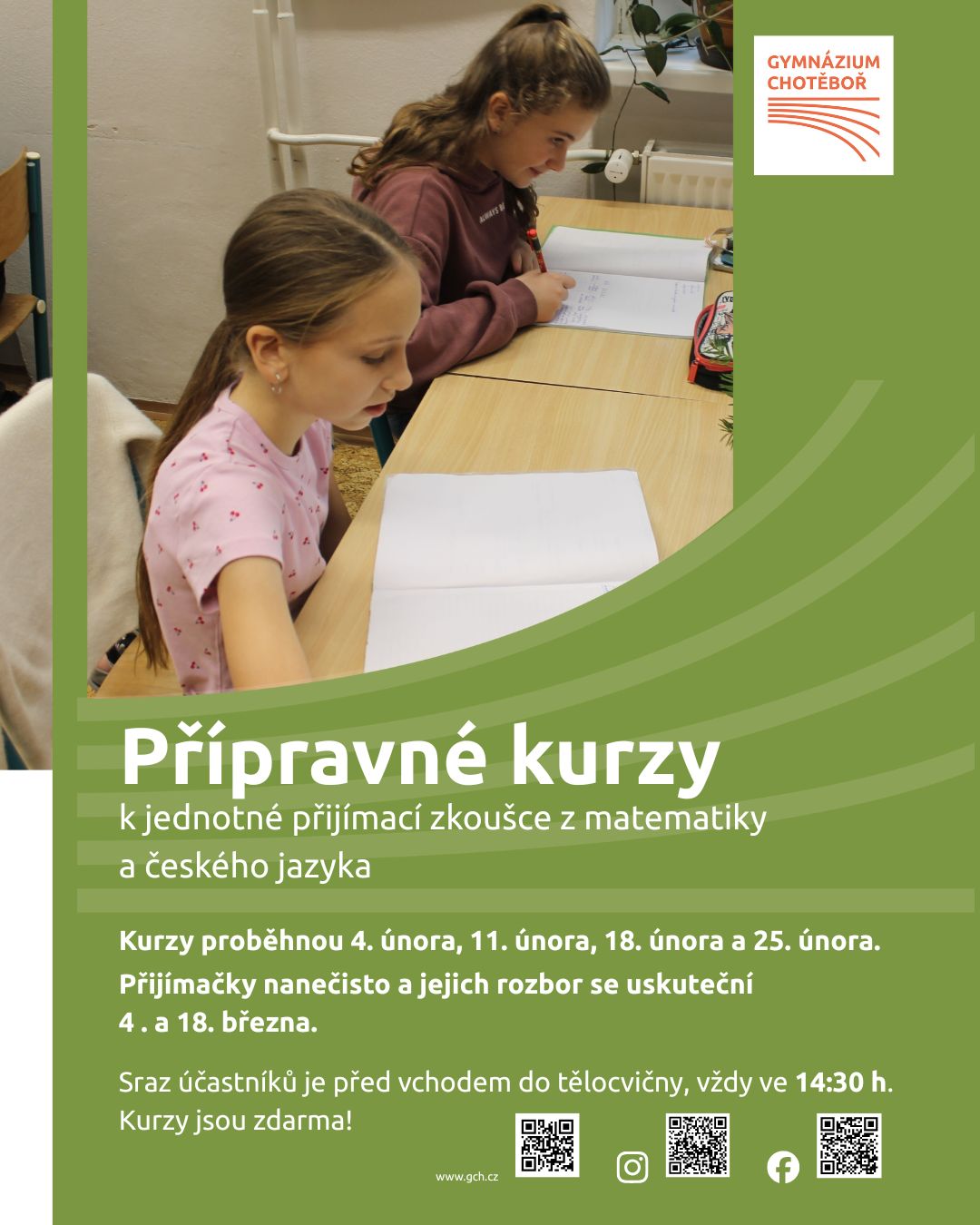 Přípravné kurzy k přijímacím zkouškám se uskuteční 4., 11., 18. a 25. února, přijímací zkoušky nanečisto 4. března 2026 a jejich rozbor 18. března.